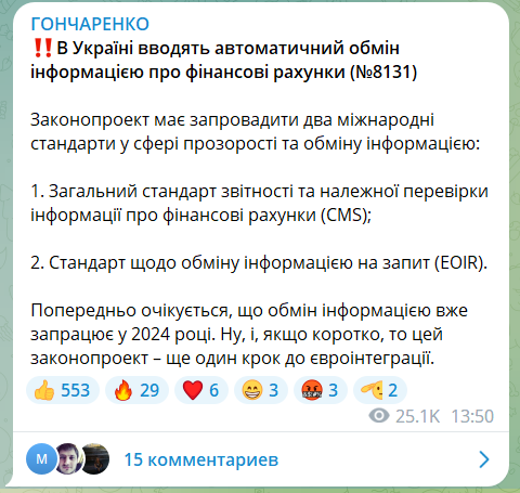 Формально в законопроекте речь идет о гармонизации нашего законодательства с европейским, в частности - внедрение в Украине стандарта автоматического обмена информацией о финансовых счетах (CRS) и стандарта по обмену информацией по запросу (EOIR).
