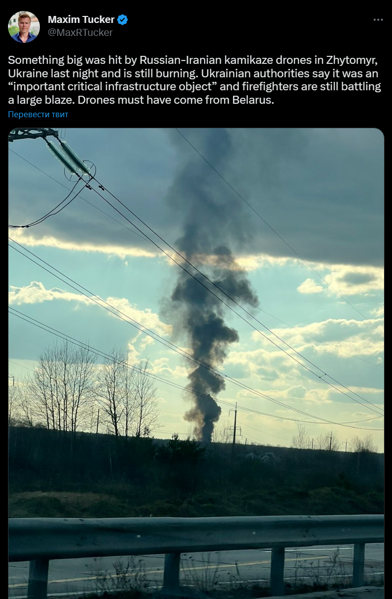 "Вчера вечером российско-иранские дроны-камикадзе сбили что-то большое в Житомире, Украина, и оно все еще горит. Украинские власти заявляют, что это был "важный объект критической инфраструктуры", и пожарные все еще борются с крупным пламенем", - написал Такер в Твиттере.
