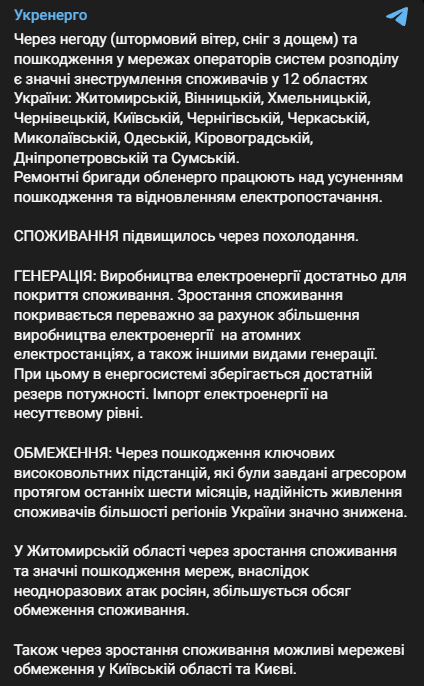 Вчера, 28 марта, из-за сильного штормового ветра со снегом в некоторых регионах Украины также применялись отключения света. В частности, речь шла  о восьми областях: Волынской, Львовской, Закарпатской, Ровенской, Хмельницкой, Тернопольской, Черновицкой, Одесской.