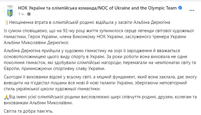 "С грустью сообщаем, что на 92 году жизни остановилось сердце легенды мировой художественной гимнастики, Героя Украины, члена Исполкома НОК Украины, заслуженного тренера Украины Альбины Николаевны Дерюгиной", - говорится в сообщении Национального Олимпийского комитета.