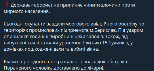 В среду, 29 марта, российские войска нанесли авиационный удар по территориям промышленных предприятий города Берислав Херсонской области.