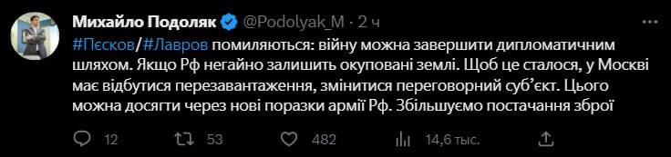 "Песков/Лавров ошибаются: войну можно завершить дипломатическим путем. Если Россия немедленно покинет оккупированные земли. Чтобы это произошло, в Москве должна произойти перезагрузка, измениться переговорный субъект. Этого можно добиться через новые поражения армии России. Увеличиваем поставки оружия", - написал Подоляк.