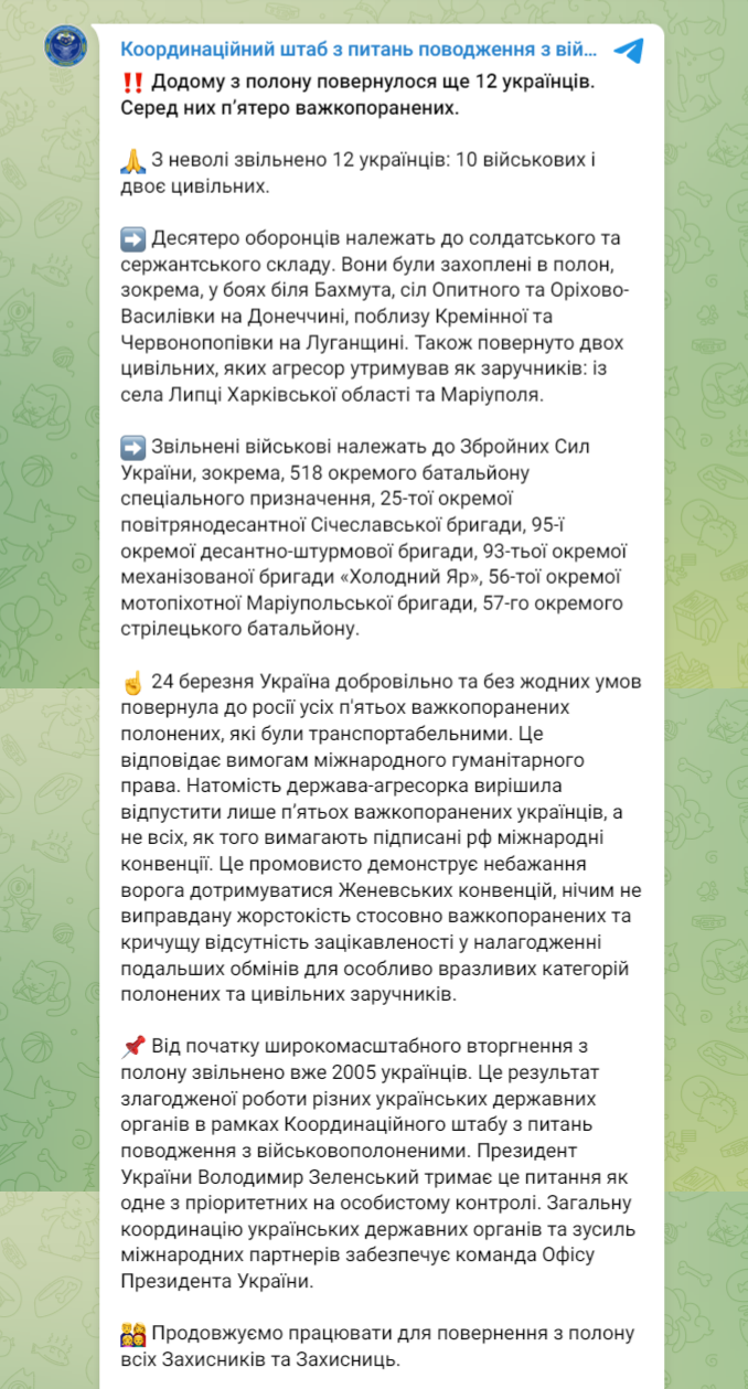 По данным Координационного штаба по вопросам обращения с военнопленными, с начала вторжения освобождены уже 2005 украинцев.