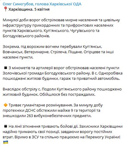 08.50 За минувшие сутки враг обстреливал мирное население и гражданскую инфраструктуру приграничных населенных пунктов Харьковской области. Речь идеи о Харьковском, Купянском, Чугуевском и Богодуховском районах.