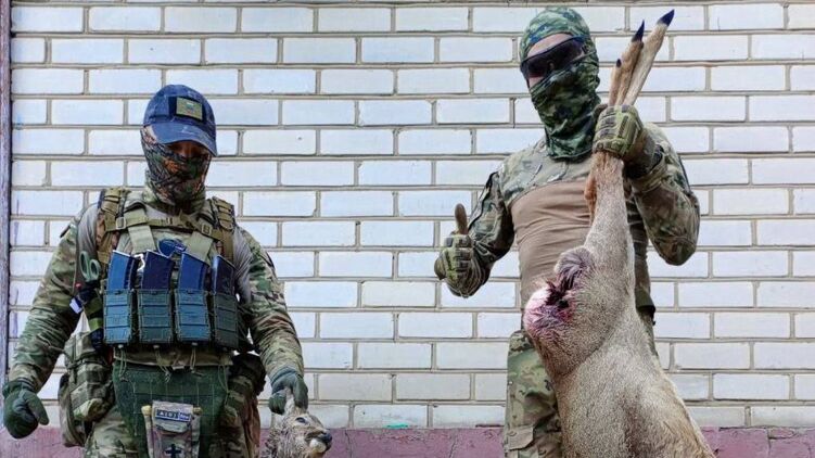 Российский телеграм-канал "Южный фронт" опубликовал фото, на котором двое военных РФ держат убитых животных - занесенных в Красную книгу оленей. Снимок подписан коротко: "Ням-ням".