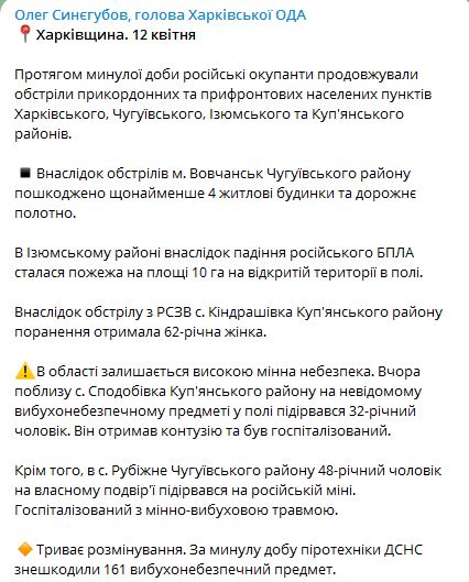 Кроме того, в с. Рубежное Чугуевского района 48-летний мужчина на собственном подворье взорвался на российской мине. Он был госпитализирован с минно-взрывной травмой.