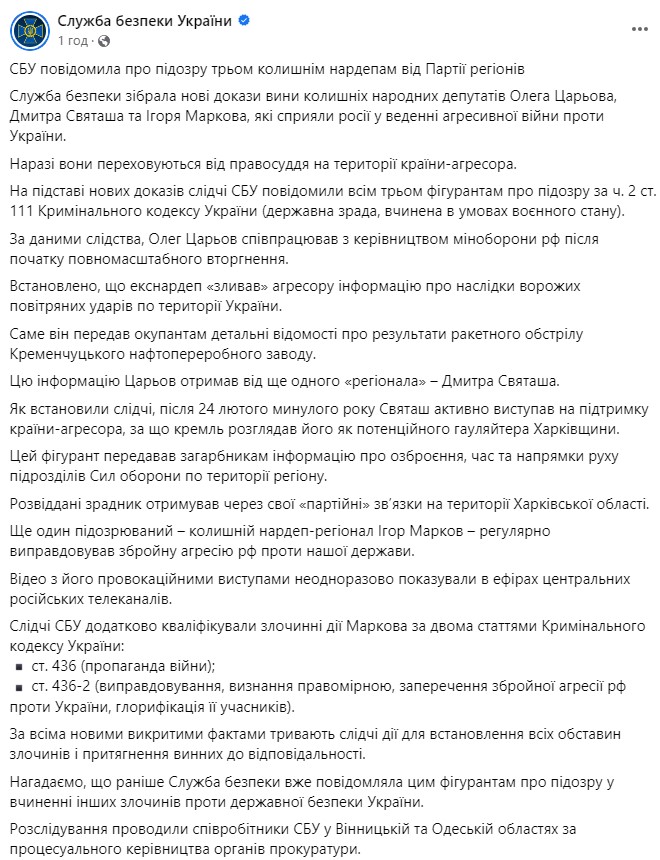 "На основании новых улик следователи СБУ сообщили всем трем фигурантам о подозрении по ч. 2 ст. 111 Уголовного кодекса Украины (государственная измена, совершенная в условиях военного положения)", - пишет СБУ.