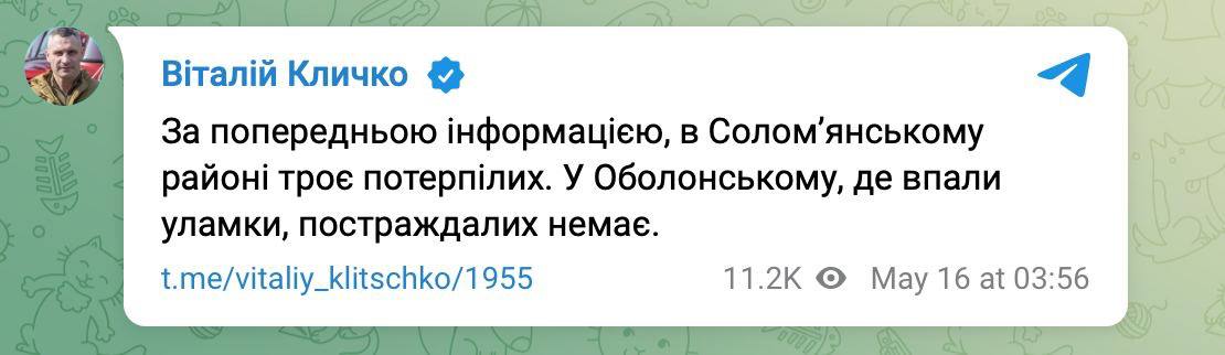 07.06 Мэр Киева Кличко сообщает о трех пострадавших в результате падения обломков в Соломенском районе.