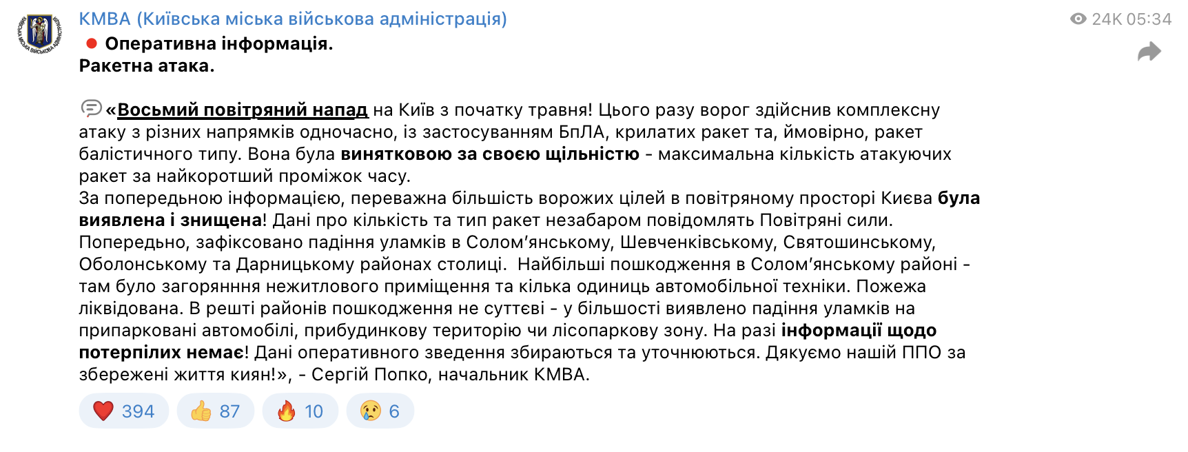 07.02 Информация о ночной атаке на Киев от главы Киевской военной администрации Сергея Попко: