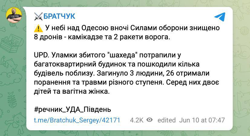20:09 Все три жертвы после падения обломков дрона в Одессе были переселенцами.