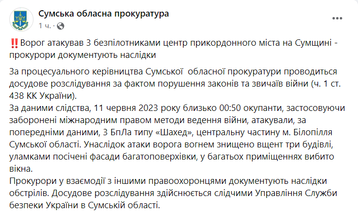 "По данным следствия, 11 июня 2023 около 00:50 оккупанты, применяя запрещенные международным правом методы ведения войны, атаковали, по предварительным данным, 3 БпЛа типа "Шахед", центральную часть г. Белополье Сумской области. В результате атаки врага огнем уничтожены три здания, обломками повреждены фасады многоэтажки, во многих помещениях выбиты окна", - говорится в сообщении прокуратуры.