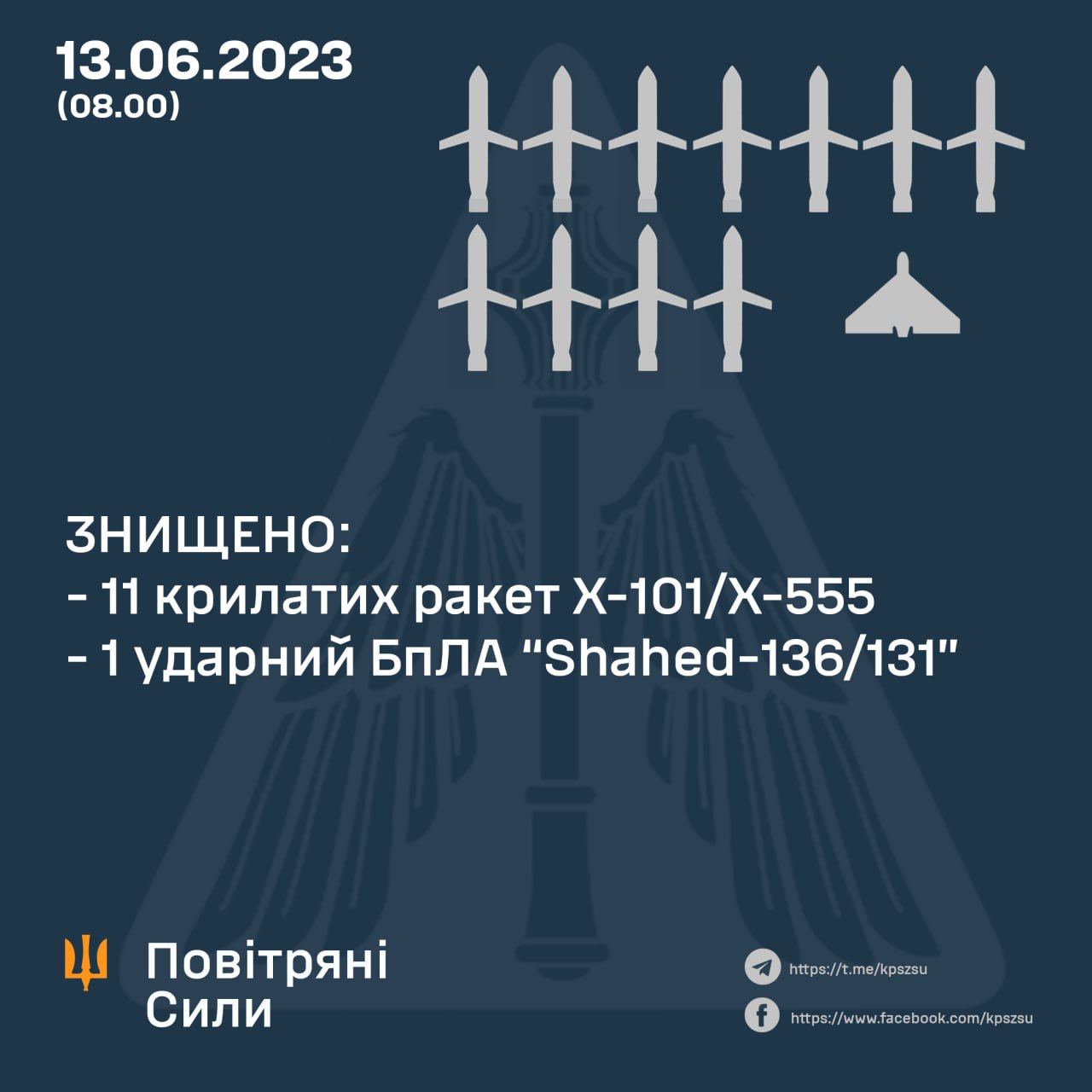 Во время ночной ракетной атаки РФ 13 июня всего выпущено 14 крылатых ракет и четыре "Шахеда". Ракеты были выпущены бомбардировщиками Ту-95МС из района Каспия, а дроны - с южного направления.