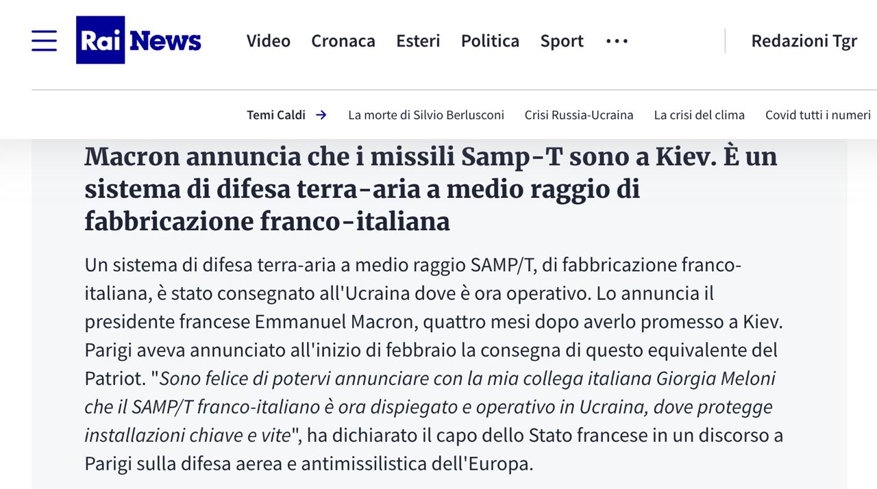 "Я рад, что могу объявить вместе с моей итальянской коллегой Джорджей Мелони, что франко-итальянский ЗРК SAMP/T теперь развернут и функционирует в Украине, где он защищает ключевые объекты и жизни людей", – цитирует Макрона издание Rai News.