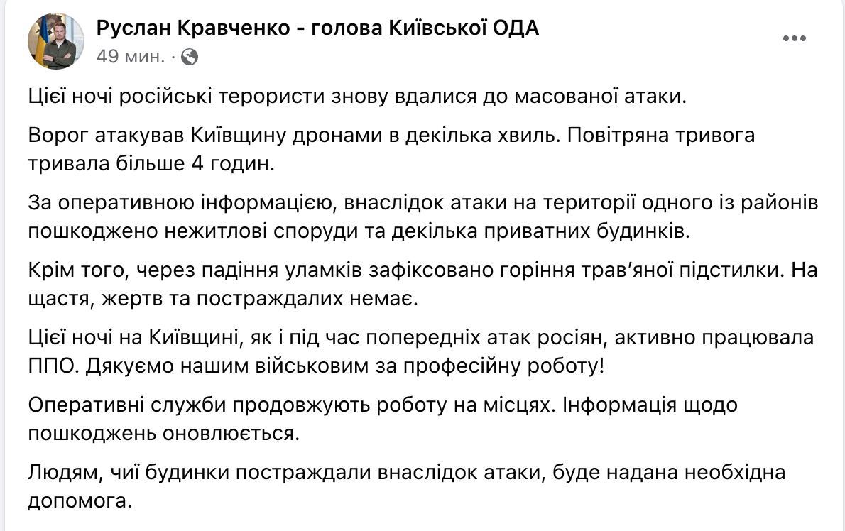 09.42 В Киевской области повреждены нежилые сооружения и несколько частных домов после ночной атаки дронами, сообщает глава ОГА Руслан Кравченко.