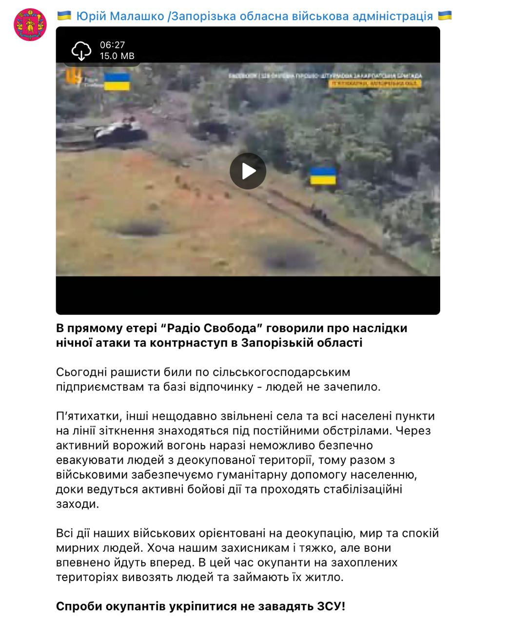 13.33 В селе Пятихатки на запорожском направлении, об освобождении которого вчера сообщило Минобороны, еще продолжаются бои, сообщил губернатор Юрий Малашко.