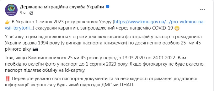 В связи с отменой карантина по закону "восстанавливаются сроки для вклеивания фотографий в паспорт гражданина Украины образца 1994 года (в виде паспорта-книжечки) по достижению лицом 25 или 45 лет".