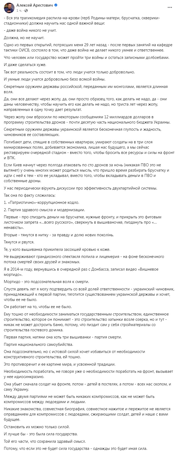 "Вся эта трагикомедия распила-на-крови должна научить нас одной важной вещи: даже война никого не учит. Должна, но не научит. Погибают дети, спящие в собственных квартирах, умирают солдаты на в три слоя минированных полях, добивается экономика, лишая нас будущего, а мы сейчас реставрируем очередной стадион - вместо того, чтобы бросить все ресурсы и силы на фронт и ВПК", - пишет Арестович.