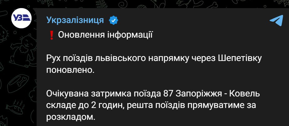Правда, около 8:20 "Укрзализныця" уведомила, что движение поездов через Шепетовку возобновлено.