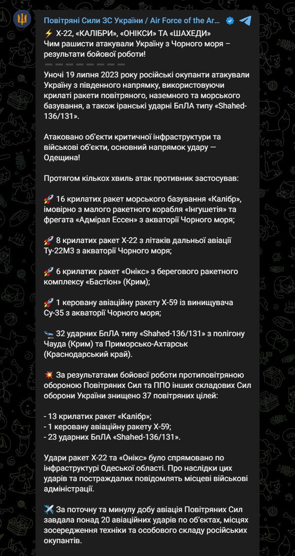 По Украине ночью 19 июля наносился комбинированный удар "Шахедами" и ракетами. Обстреляли Одессу, Коблево Николаевской области, Житомирщину и другие города и области.