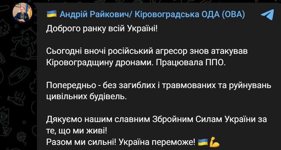 08:56 Об атаке дронов этой ночью заявили власти Кировоградской области.