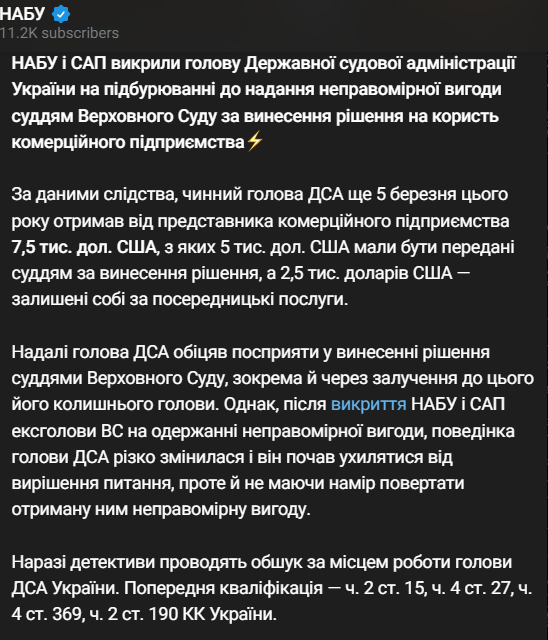 По данным следствия, взятка в размере 7,5 тыс. долларов была передана еще в марте, из которых 5 тысяч долларов США должны были быть переданы судьям за вынесение решения, а 2,5 тысячи долларов США - оставлены себе за посреднические услуги.
