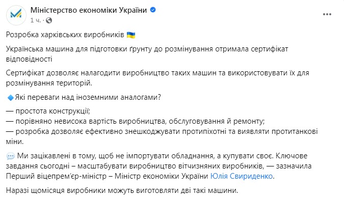 Отечественная машина для разминирования. Фото: facebook.com/mineconomdev