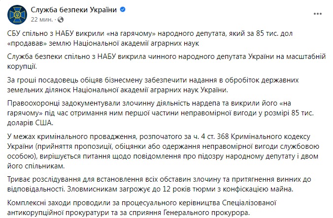 СБУ совместно с НАБУ разоблачили народного депутата, который за 85 тысяч долларов продавал землю Национальной академии аграрных наук. За деньги парламентарий обещал бизнесмену обеспечить предоставление участков академии под возделывание.