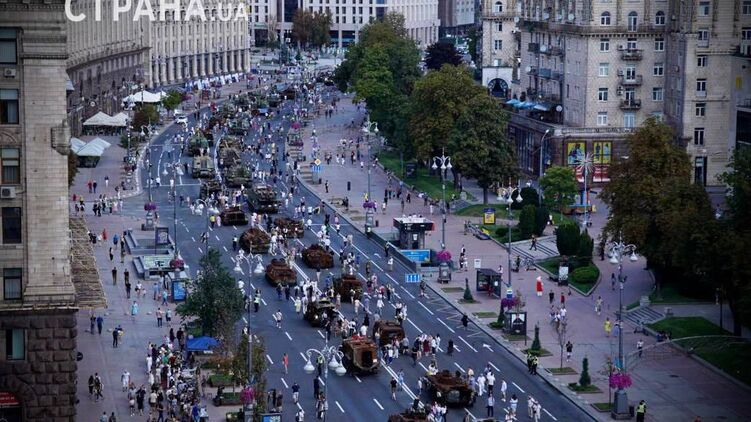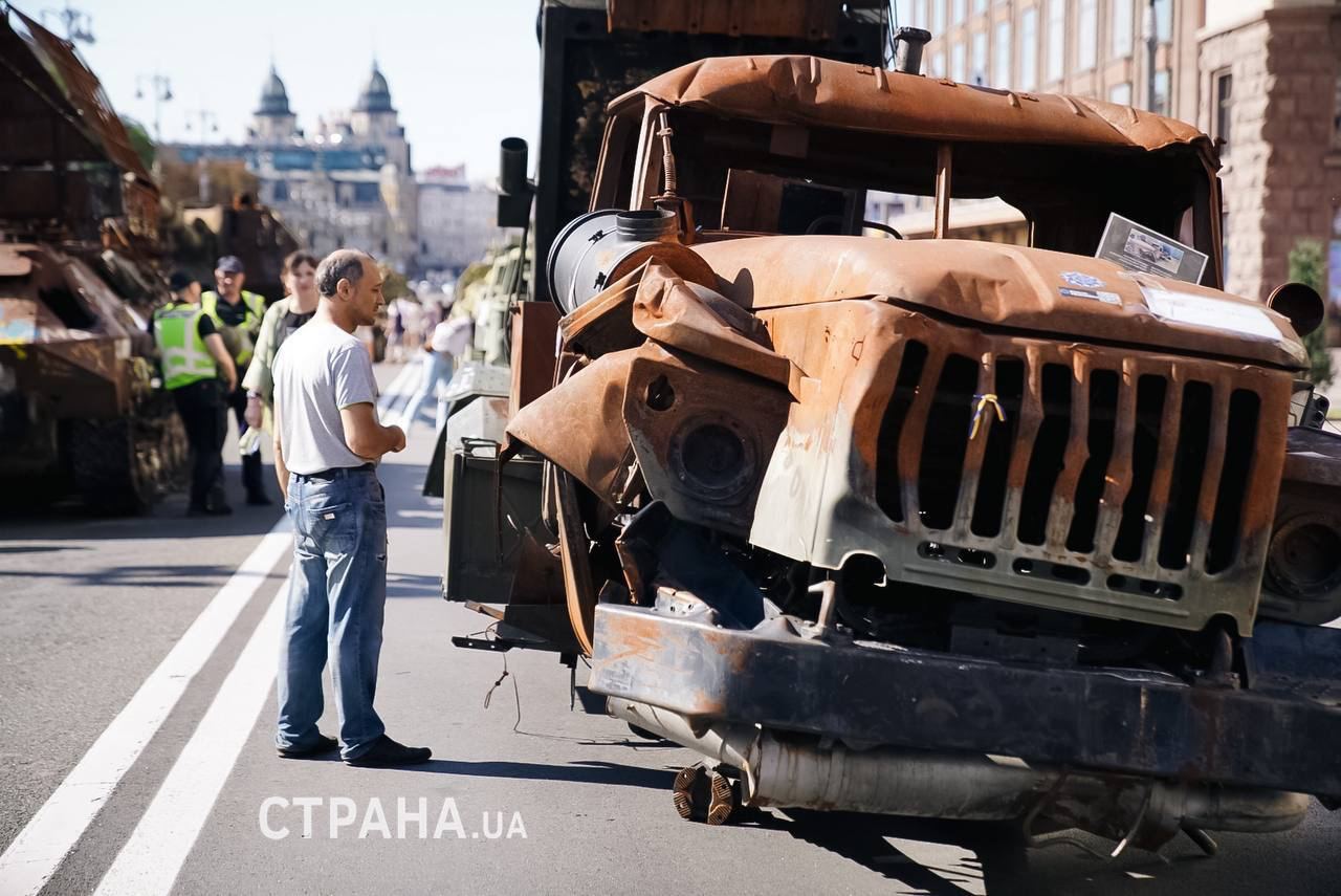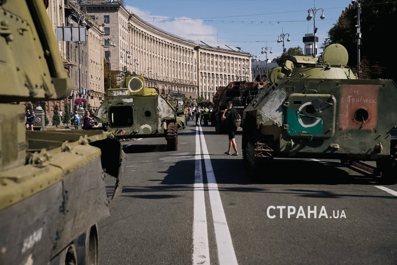 Всего на Крещатике выставили около 28 единиц техники. Среди них — самоходные гаубицы, части сбитых ракет, БМП, БТР танки и другие бронемашины.