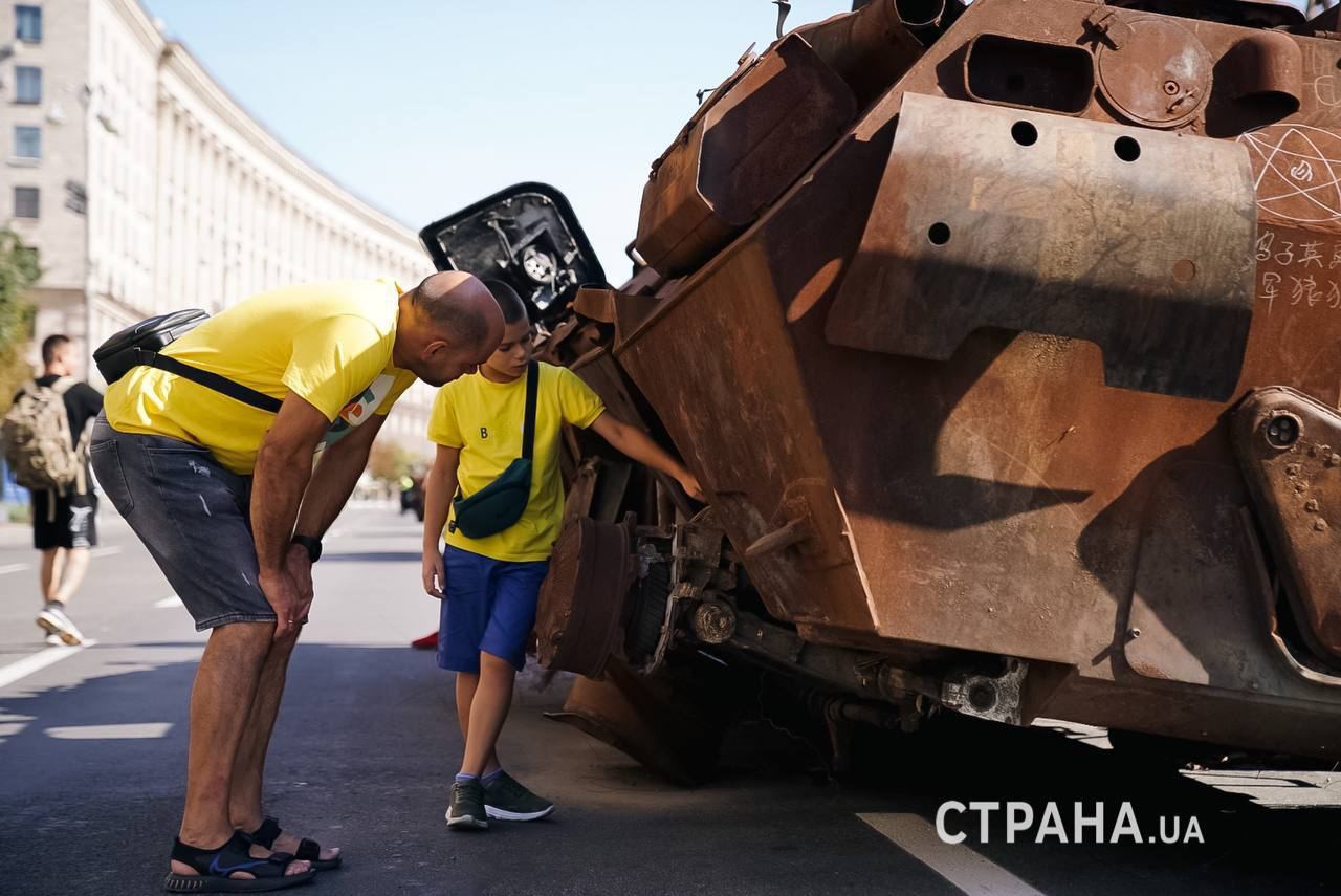 В Киеве на Крещатике в День независимости открыли выставку трофейной российской техники, которую установили на улице раньше, но закрыли оградительной лентой.