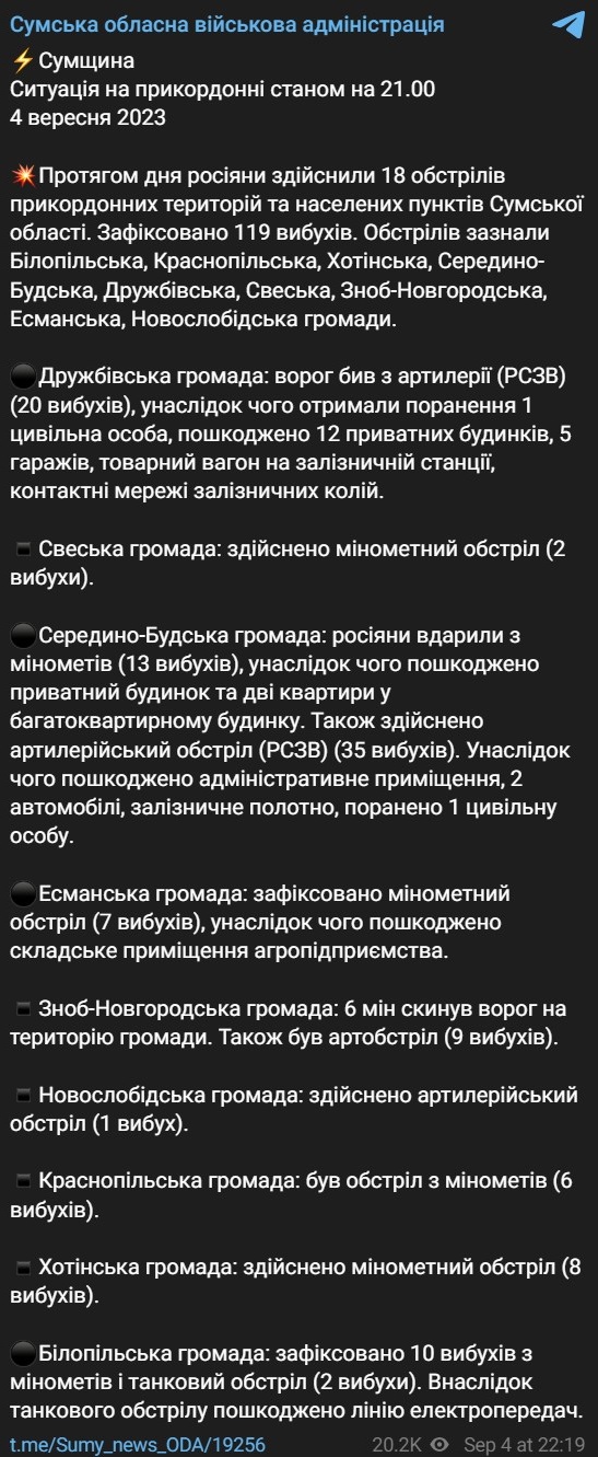 07:15 В течение минувшего дня россияне совершили 18 обстрелов приграничных территорий и населенных пунктов Сумской области. Зафиксировано 119 взрывов. Обстрелы потерпели Белопольская, Краснопольская, Хотинская, Середино-Будская, Дружбовская, Свесская, Зноб-Новгородская, Эсманская, Новослободская громады.