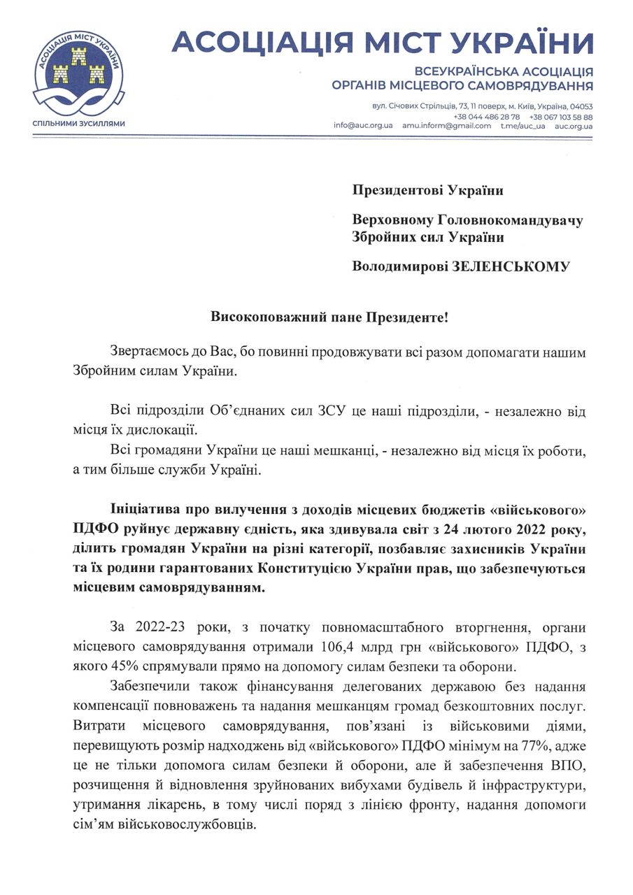 В нем сказано, что "инициатива изъятия из доходов местных бюджетов "военного" НДФЛ разрушает государственное единство, которое удивило мир с 24 февраля 2022 года, делит граждан Украины на разные категории, лишает защитников Украины и их семьи гарантированных Конституцией Украины прав, обеспечиваемых местным самоуправлением".