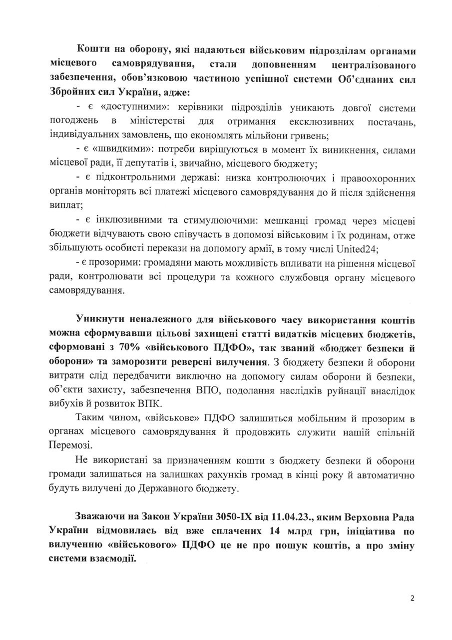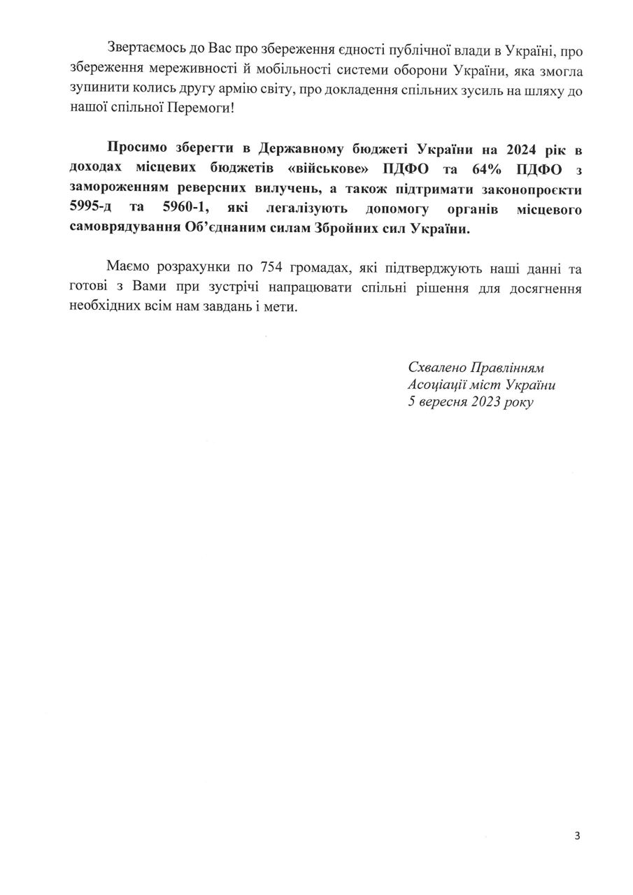 "Просим сохранить в государственном бюджете Украины на 2024 год в доходах местных бюджетов "военный" НДФЛ и 64% НДФЛ (есть информация, что в правительстве хотят эту долю сократить до 50% - Ред.) с заморозкой реверсных изъятий, а также поддержать законопроекты 5995-д и 5960-1, легализующие помощь органов местного самоуправления Объединенным силам Украины", - сказано в документа.