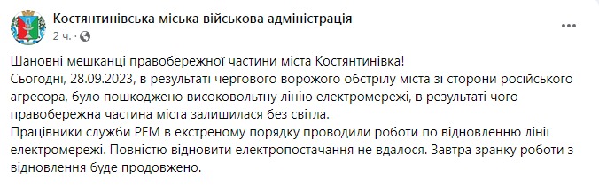 Об этом сообщается в Фейсбуке Константиновской городской военной администрации.