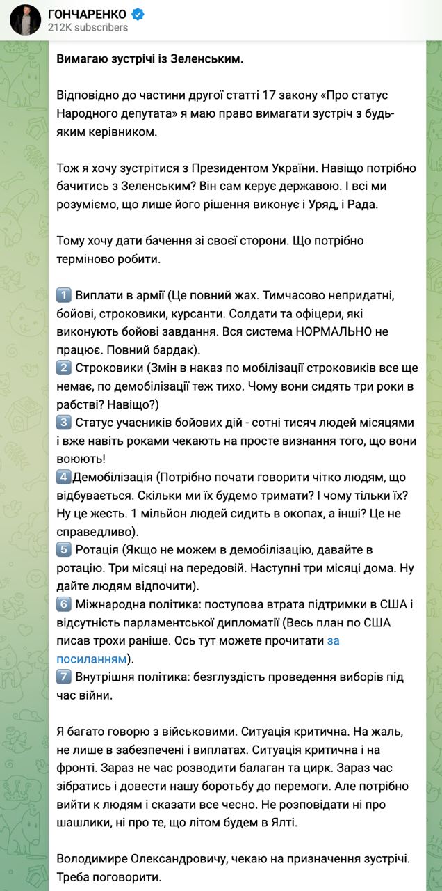Народный депутат от "Европейской солидарности" Алексей Гончаренко заявил о критической ситуации в украинской армии и на фронте. Он требует встречи с президентом, чтобы обсудить самые острые вопросы.