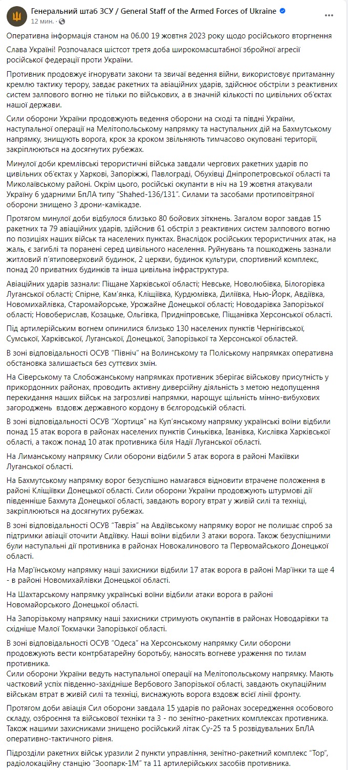В четверг, 19 октября, в Украине идет 603-й день войны с Россией.