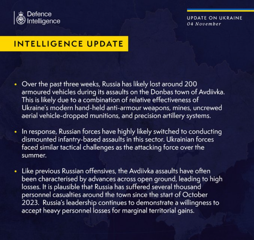 По данным Минобороны Британии, как и предыдущие российские наступления, штурмы Авдеевки часто характеризовались продвижением по открытой местности, что приводило к большим потерям. Вполне вероятно, что с начала октября 2023 года Россия понесла потери в нескольких тысячах человек в окрестностях города.