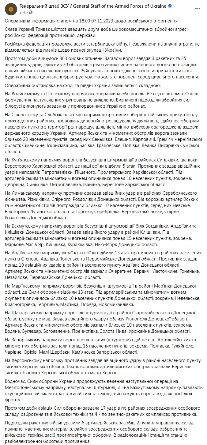 Во вторник, 7 ноября, в Украине идет 622-й день войны с Россией.
