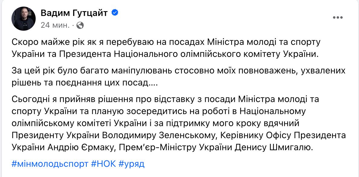 В Фейсбуке Гутцайт объяснил причину своей отставки: он уже год совмещает министерский портфель с должностью президента Национального олимпийского комитета Украины.