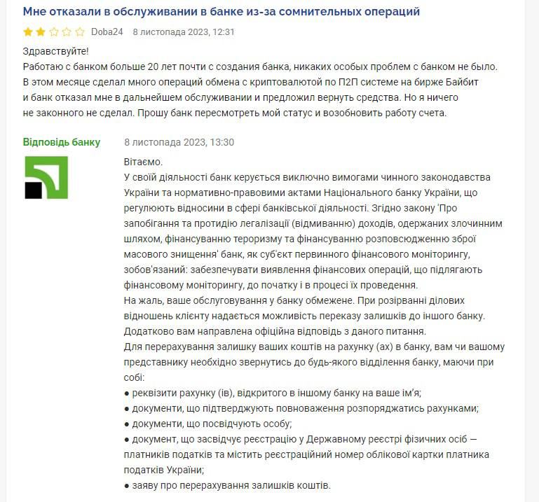 "Работаю с банком больше 20 лет почти с создания банка, никаких особых проблем с банком не было. В этом месяце сделал много операций обмена с криптовалютой по П2П системе на бирже "Байбит", и банк отказал мне в дальнейшем обслуживании и предложил вернуть средства. Но я ничего незаконного не сделал", — заявил один из клиентов Приватбанка.