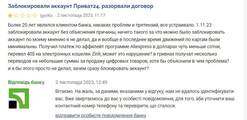 "Получил платеж по аффилейт-программе Aliexpress в долларах чуть меньше сотни, перевел 40$ на электронный кошелек Zenli. Может, это нарушение? В гривнах получал несколько переводов на небольшие суммы за продажу цифровых товаров. Хотя бы объяснили, в чем проблема. И я бы этого просто не делал. Зачем сразу блокировать аккаунт?" — недоумевает клиент Приватбанка Игорь.