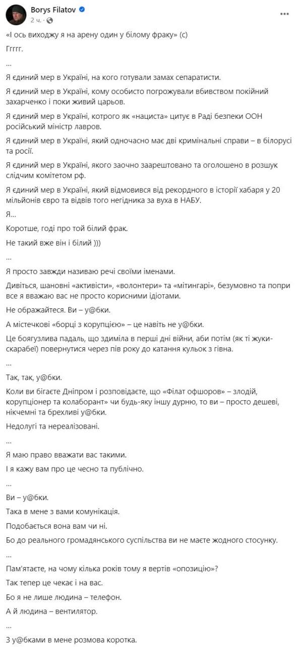 Накануне акции Филатов опубликовал несколько постов. В одном из них он написал, что городской бюджет Днепра много помогает ВСУ. В другом - провел мысль, что центральная власть, организуя эти акции, выпускает "джина из бутылки" и вскоре могут начаться митинги "матери против войны" и за демобилизацию украинских военных.