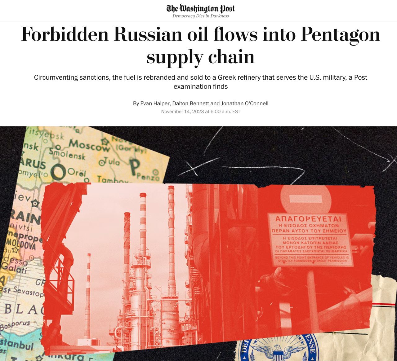 Греческое предприятие заявило инвесторам, что прекратило принимать запрещенную нефть и вместо этого нашло другие источники. Однако эксперты уверены, что мазут, который Пентагон закупает для кораблей и самолетов, содержит российскую нефть. По их оценкам, после введения западных санкций российские поставки в турецкий терминал "Дортель" составили 2,7 миллиона баррелей, или более 69% мазута, отправленного туда морским транспортом с февраля.