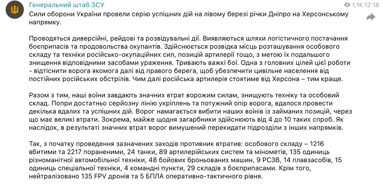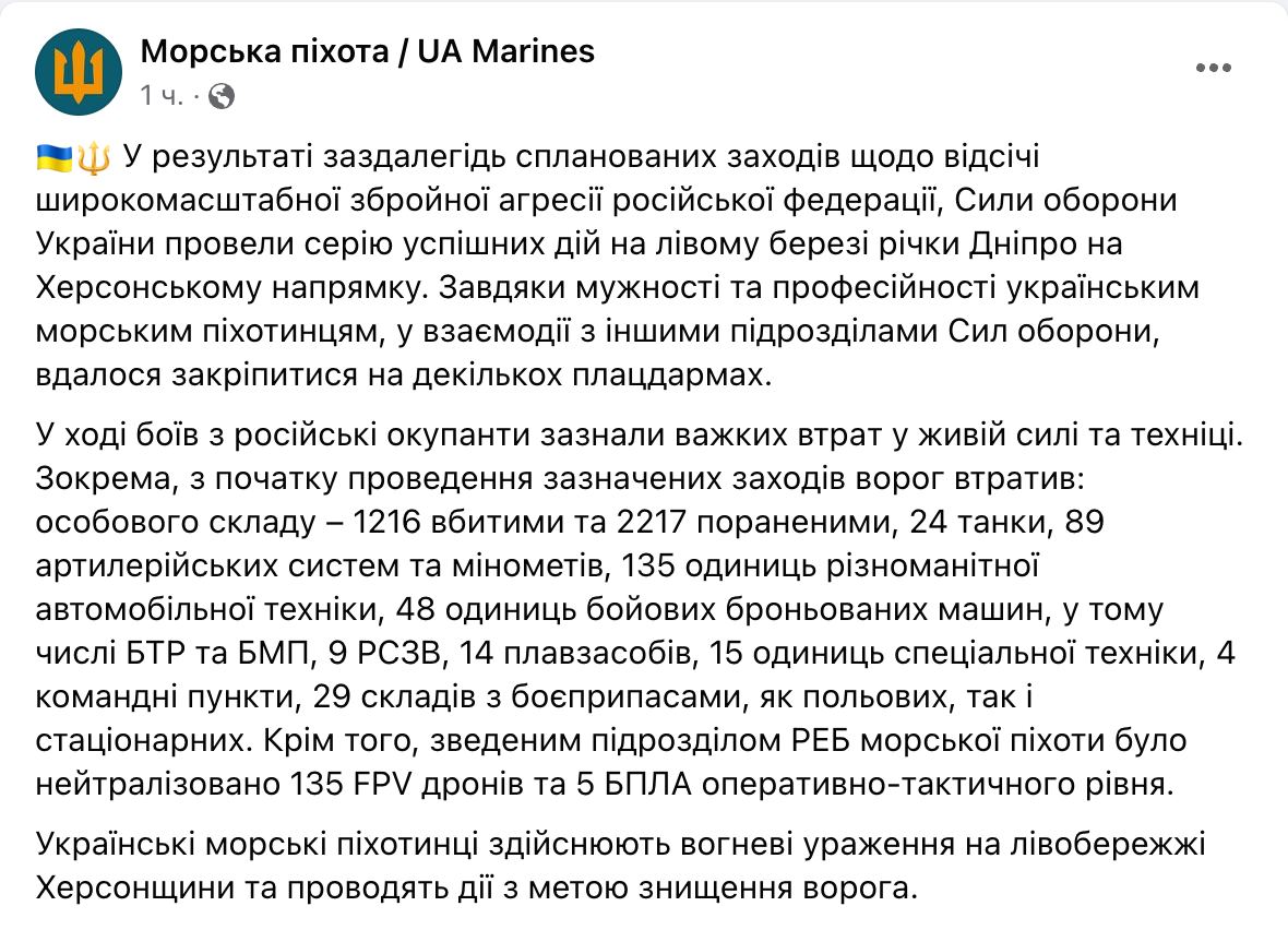 "Силы обороны Украины провели серию успешных действий на левом берегу реки Днепр на Херсонском направлении. Украинским морским пехотинцам, во взаимодействии с другими подразделениями Сил обороны, удалось закрепиться на нескольких плацдармах", - сообщают морпехи.