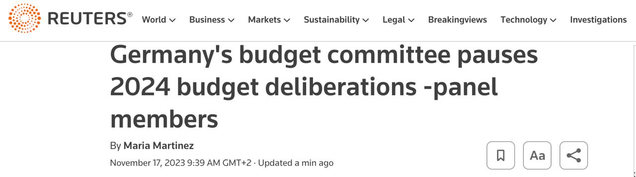 10.00 В Германии из-за огромной дыры в бюджете зависла в том числе удвоенная помощь Украине на 2024 год в размере 8 миллиардов евро, сообщает Reuters.