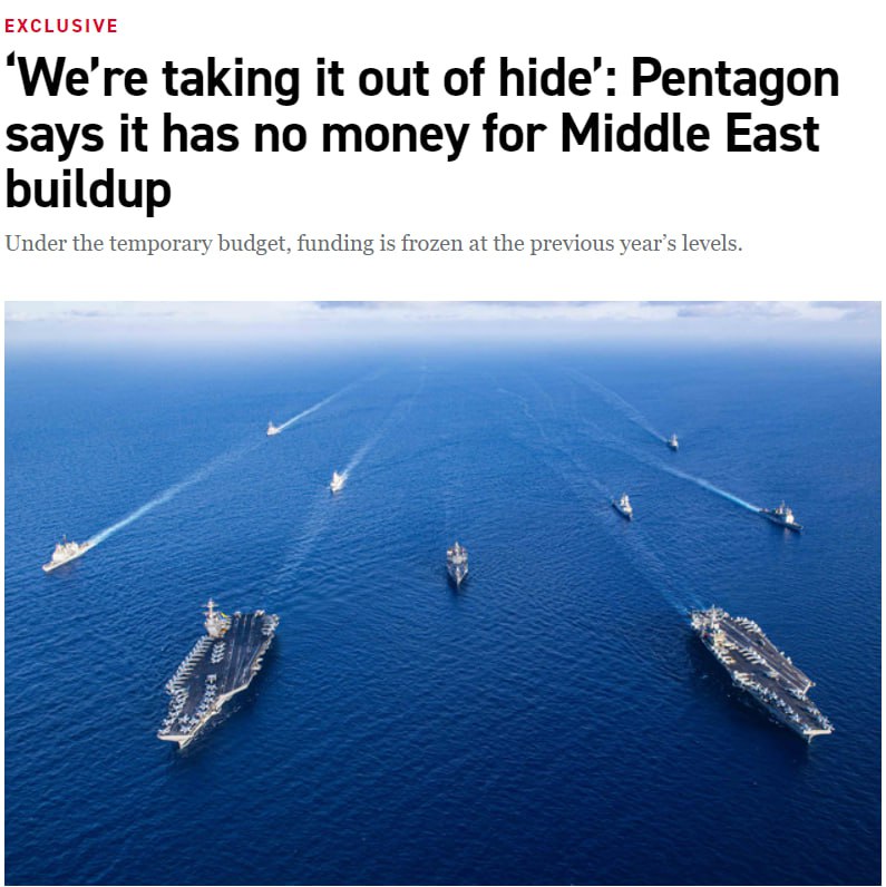 Военные, как и вся власть США, действуют в рамках временной меры финансирования, которая замораживает расходы на уровне предыдущего года. А поскольку передвижение войск на Ближнем Востоке не было запланировано, Пентагону пришлось изъять деньги с существующих счетов операций и технического обслуживания, сообщил представитель Министерства обороны США Крис Шервуд.