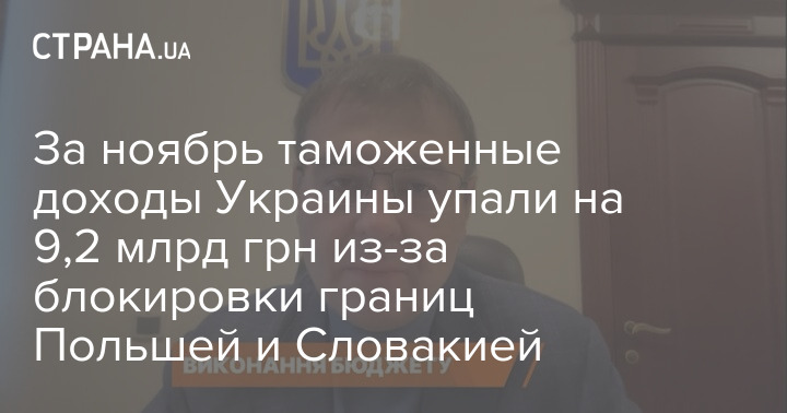 Денежные поступления Украины от таможни упали на 9,2 миллиарда гривен за ноябрь из-за блокады пограничных переходов со стороны Польши и Словакии.