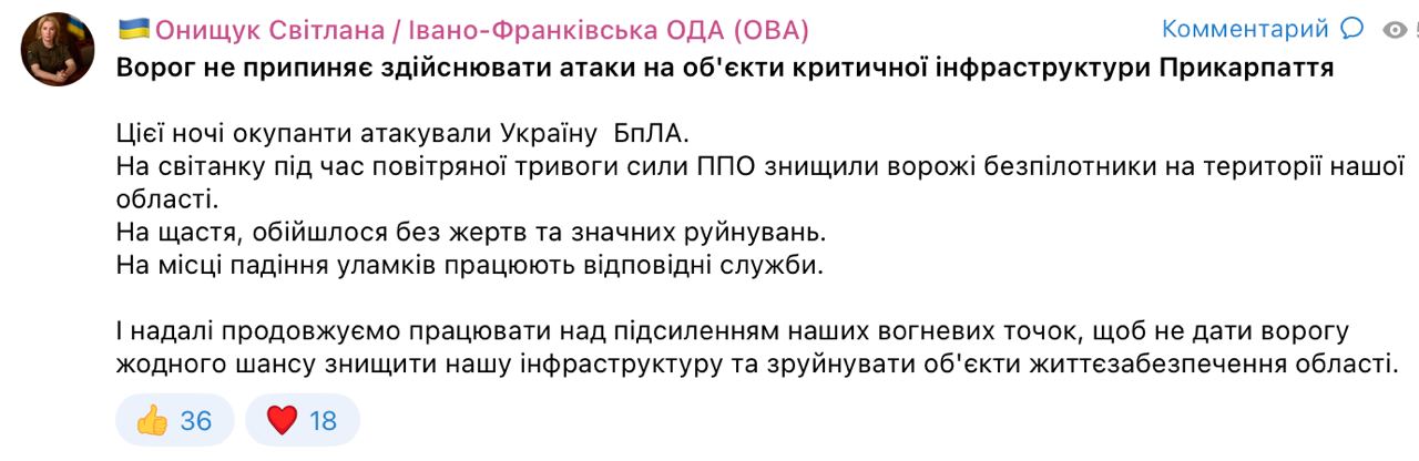 09.50 Ночью "Шахиды" атаковали критическую инфраструктуру Прикарпатья, сообщает ОВА.
