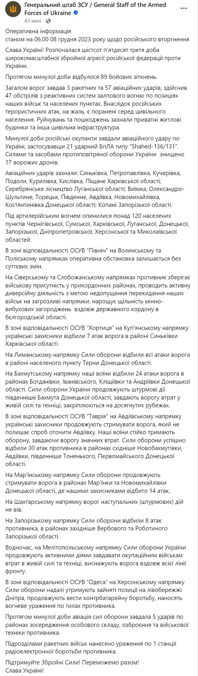 За прошедшие сутки произошло 89 боевых столкновений. Всего россияне нанесли 3 ракетных и 57 авиационных ударов, совершили 47 обстрелов из реактивных систем залпового огня по позициям наших войск и населенным пунктам.