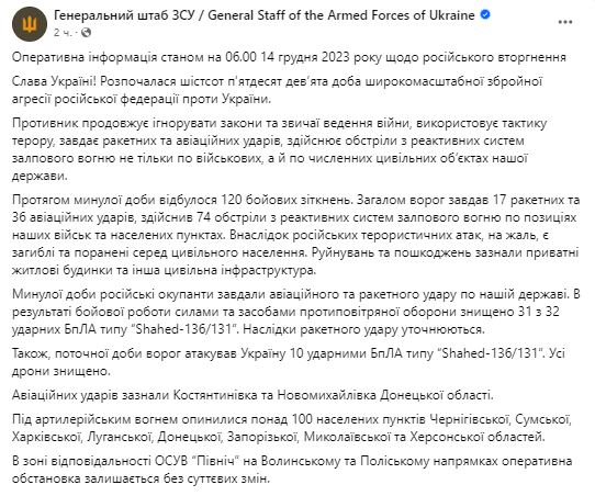 Утром 14 декабря Генштаб ВСУ обнародовал сводку о ситуации на фронте за минувши сутки.