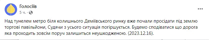 "Над тоннелем метро возле бывшего Демеевского рынка уже начали проседать под землю торговые павильоны. Судя по всему, ситуация ухудшается. Будем надеяться, что дорога, которая проходит совсем рядом, останется невредимой", - сказано в посте.